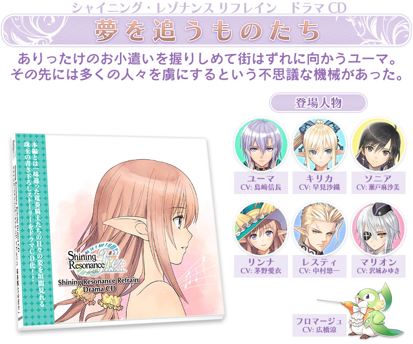 超豪華限定版特典「シャイニング・レゾナンス リフレイン -Premium Fan Box-」に収録されているドラマCDの中から「夢を追うものたち」の一部を試聴いただけます。